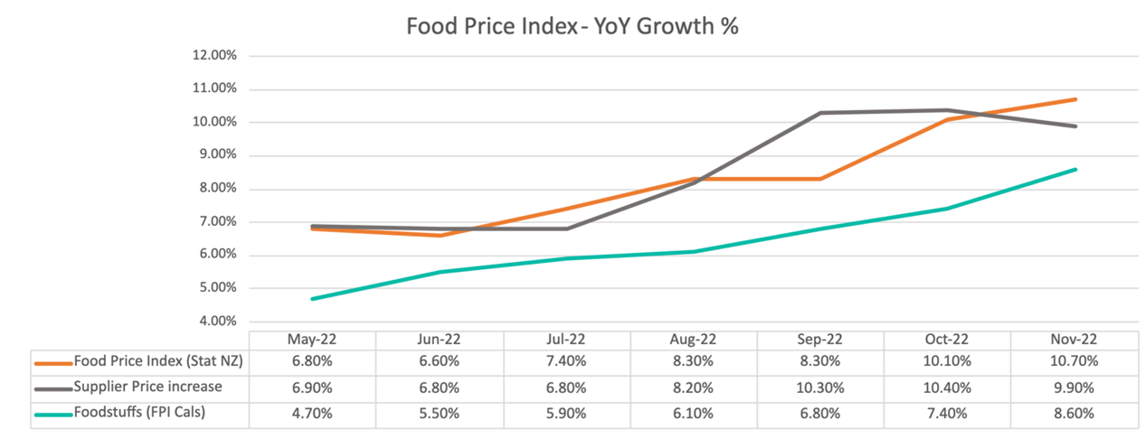 Stats NZ Food Price Index (FPI) shows food prices increased 10.7% for November 2022 compared to a year ago.