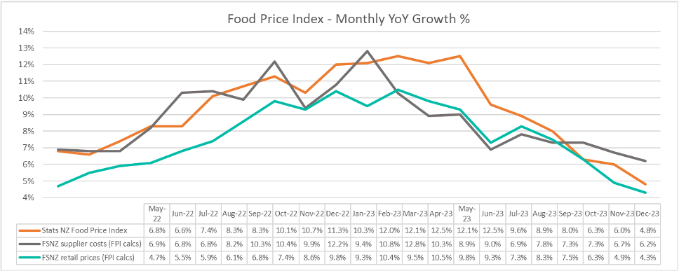 Latest data from Stats NZ and Foodstuffs shows a continued decline in the rate of food price inflation in New Zealand. Stats’ Food Price Index (FPI), which tracks the price of a representative basket of goods from retailers around the country, shows food prices rose 4.8%pa in December, compared to year ago.